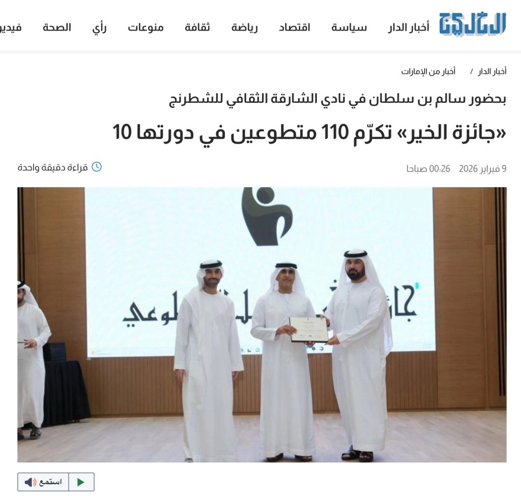 بحضور سالم بن سلطان في نادي الشارقة الثقافي للشطرنج «جائزة الخير» تكرّم 110 متطوعين في دورتها 10